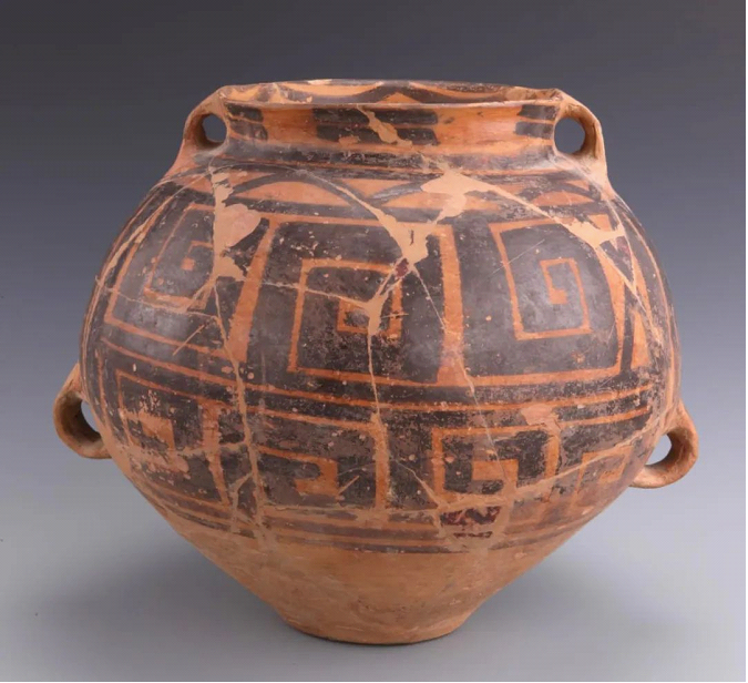 描述:泥質(zhì)橙黃陶,侈口,短束頸,斜肩,垂折腹,平底,肩部有對稱雙耳,施黑紅彩,口沿內(nèi)飾垂弧紋,頸飾平行條紋,肩飾反向的回形紋,腹部為寬帶紋,其間飾點紋。