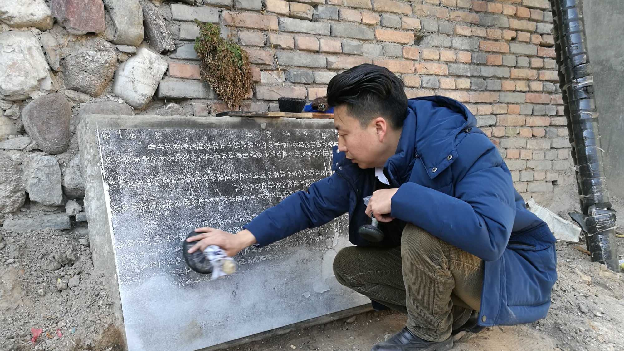 圖為張欽仲發(fā)現(xiàn)《重修平涼城隍廟碑記》并制作拓片(崆峒區(qū)融媒體中心供圖)