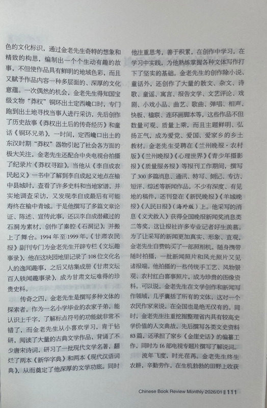 傳奇之四,金老先生是撰寫多種文體的探索者。作為一名小學(xué)畢業(yè)的農(nóng)家子弟,能認(rèn)識(shí)上千字,了解標(biāo)點(diǎn)符號(hào)的功能就非常不錯(cuò)了,而金老先生從小喜歡學(xué)習(xí),肯于鉆研,閱讀了大量的古典文學(xué)作品,背誦了不少唐宋詩(shī)詞,研習(xí)了一批現(xiàn)代文學(xué)名著,翻爛了兩本《新華字典》和兩本《現(xiàn)代漢語(yǔ)詞典》,從而奠定了他深厚的文學(xué)功底。同時(shí)他注重思考,善于積累,在創(chuàng)作中學(xué)習(xí),在學(xué)習(xí)中實(shí)踐,為他熟練掌握各種文體寫作打下了堅(jiān)實(shí)的基礎(chǔ)。金老先生的創(chuàng)作除小說、童話外,還創(chuàng)作了大量的散文、雜文、詩(shī)歌、童謠、寓言、報(bào)告文學(xué)、文藝評(píng)論、戲劇、小戲小品、曲藝、歌曲、彈唱、相聲、快板、楹聯(lián)、連環(huán)畫腳本等,這些作品不但數(shù)量可觀、質(zhì)量上乘,而且主題鮮明、弘揚(yáng)正氣,成為愛黨、愛國(guó)、愛家鄉(xiāng)的鄉(xiāng)土教材。金老先生受聘在《蘭州晚報(bào)·農(nóng)村版》《蘭州晚報(bào)》《心理世界》《青少年攝影報(bào)》《質(zhì)量服務(wù)報(bào)》等報(bào)刊工作期間,撰寫了300多篇消息、通訊、特寫、側(cè)記、專訪、短評(píng)、綜述等新聞作品,不少有深度、有見地的稿件,還刊登在《新民晚報(bào)》《羊城晚報(bào)》《人民日?qǐng)?bào)》(海外版)上。他采寫的消息《義犬救人》獲得全國(guó)晚報(bào)新聞獎(jiǎng)消息類二等獎(jiǎng),這讓報(bào)社許多專業(yè)記者好生羨慕。為了讓采寫的新聞更加真實(shí)、形象、直觀,金老先生自費(fèi)購(gòu)買了一部照相機(jī),隨身攜帶隨時(shí)拍攝,一批新聞?wù)掌惋L(fēng)光照片又見諸報(bào)端。他拍攝的一些傳統(tǒng)手工藝、風(fēng)物景觀、農(nóng)村紅白喜事照片,成為珍貴的圖像資料。可以說,金老先生在文學(xué)創(chuàng)作和新聞寫作領(lǐng)域,幾乎囊括了所有的文體,這對(duì)一個(gè)農(nóng)民作家來說,在全國(guó)也是絕無僅有的。同時(shí),金老先生注重挖掘整理省內(nèi)具有較高史學(xué)價(jià)值的人文典故,先后撰寫各類文史資料83篇,還承擔(dān)了家鄉(xiāng)《金崖史話》的編纂工作,同時(shí)為16部電視專題片撰寫了解說詞。