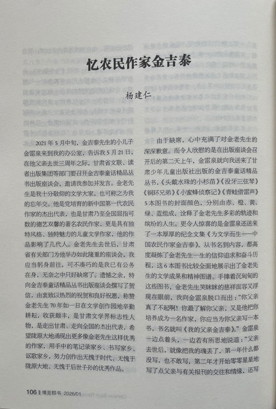 由于缺席,心中充滿了對(duì)金老先生的深深歉意。而令人欣慰的是在出版座談會(huì)召開后的第二天上午,金雷泉就向我送來了甘肅少年兒童出版社出版的金吉泰童話精品叢書,《頭戴水珠的小杉苗》《沒牙三弦琴》《銅環(huán)兄弟》《小蜜蜂偵察記》《青蛙借雷聲》5本圖書的封面顏色,分別由赤、橙、黃、綠、藍(lán)組成,詮釋了金老先生多彩的軌跡和繽紛的人生。更令人驚喜的是金雷泉還送來了一本厚厚的紀(jì)念文集《為文學(xué)而生——中國(guó)農(nóng)民作家金吉泰》,從書名到內(nèi)容,都高度凝練了金老先生一生的信仰追求和奮斗歷程,這6本圖書比較全面地展示出了金老先生的文學(xué)成果和精神圖譜。手捧著沉甸甸的這些圖書,金老先生笑瞇瞇的慈祥面容又浮現(xiàn)在眼前,我向金雷泉脫口而出:“你父親真了不起?。∧阕盍私饽愀赣H,又是他把你培養(yǎng)成為一名作家,你應(yīng)當(dāng)為你父親寫一本書,書名就叫《我的父親金吉泰》。”金雷泉一邊點(diǎn)著頭,一邊若有所思地說道:“父親去世后,就像把我的魂丟了,第一年什么都沒寫,也不敢寫,第二年才開始零零星星地寫了點(diǎn)父親與有關(guān)報(bào)刊的交往和情緣,還寫了點(diǎn)父親在生活和寫作中的軼事趣聞。您的建議非常好,我擔(dān)心駕馭不好,試試看吧。”我感覺金雷泉有點(diǎn)為難,馬上又安慰他:“不急,你用兩三年時(shí)間慢慢寫。”