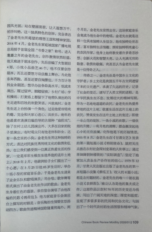 從此之后,我與金老先生的交往越來越密切,交流的話題也越來越廣泛,每次見面,他給我最多的就是鼓勵(lì):“小楊啊,你在《人民日?qǐng)?bào)》上發(fā)表的寫奧運(yùn)會(huì)的散文,看得我都激動(dòng)了。”“小楊啊,《詩(shī)刊》上發(fā)表大作了,值得祝賀!”“小楊啊,你的創(chuàng)作達(dá)到了新的水準(zhǔn),都登上國(guó)刊《人民文學(xué)》了。”有一次,金老先生得知我在《星星》詩(shī)刊舉辦的首屆農(nóng)民工詩(shī)歌大獎(jiǎng)賽中獲獎(jiǎng)的消息后,專門打來電話:“小楊啊,向你表示祝賀,你的獲獎(jiǎng)作品表達(dá)了我們農(nóng)民工的心聲!”金老先生與人相處,傳遞的絕對(duì)是正能量,從我與他交往的30多年時(shí)光里,從來沒有聽到過他非議別人。后來才慢慢發(fā)現(xiàn),他有與眾不同的精神境界、質(zhì)樸品格、為人方式和處事態(tài)度,他靈魂深處永遠(yuǎn)流淌著向善、向上、向真、向美的價(jià)值取向,渾身上下始終洋溢著執(zhí)著、豁達(dá)、樂觀、寬容的人格魅力。一個(gè)地地道道的農(nóng)民,從當(dāng)年只有小學(xué)文化程度,靠勤奮自學(xué)70年堅(jiān)持筆耕不輟,出版各種作品集25部,共計(jì)400多萬字,被中共甘肅省委、甘肅省人民政府授予“甘肅省文藝終身成就獎(jiǎng)”。對(duì)一個(gè)農(nóng)民來說,這在全國(guó)也是屈指可數(shù)的。年近80歲的時(shí)候,在患嚴(yán)重眼疾幾乎導(dǎo)致雙目失明的情況下,每天堅(jiān)持寫作兩三千字,用10個(gè)月時(shí)間,完成了45萬字的長(zhǎng)篇小說《農(nóng)耕圖》,榮獲甘肅省文學(xué)藝術(shù)類政府最高獎(jiǎng)——敦煌文藝獎(jiǎng),金老先生的頑強(qiáng)毅力和拼命勁頭也是罕見的。20世紀(jì)80年代初,他以家鄉(xiāng)榆中縣金崖鄉(xiāng)文化站為依托,創(chuàng)辦了全省第一個(gè)農(nóng)民文學(xué)社——苑川文學(xué)社,舉辦“文學(xué)創(chuàng)作講習(xí)班”,吸引方圓村鎮(zhèn)100多名“泥腿子”文學(xué)愛好者參與其中,每當(dāng)經(jīng)他修改、推薦的作品發(fā)表后,年過半百的他總是騎上自行車跑幾十公里路,喜滋滋地將樣報(bào)樣刊送到作者手里,金老先生樂此不疲為文學(xué)愛好者全方位服務(wù)的情懷,在當(dāng)下是不多見的,更加顯得彌足珍貴。興趣廣泛的金老先生在晚年時(shí)突發(fā)奇想,在老宅院子里啟動(dòng)了家庭美化工程,自己設(shè)計(jì)、自己施工,在自家院子西墻上,用五顏六色的小石子創(chuàng)作了一幅長(zhǎng)八米、寬二米的巨型壁畫,畫面上有紅日、山水、碌碡、西瓜、樹木、小鹿、大雁、人物,還有太陽(yáng)灶、飛機(jī)、衛(wèi)星,好一幅天人合一的田園風(fēng)光畫。站在壁畫面前,讓人遐想萬千、拍手叫絕,這一獨(dú)具特色的創(chuàng)舉,完全表達(dá)了金老先生所渴望的理想王國(guó)和精神家園。2014年4月,金老先生家庭被國(guó)家廣播電視總局授予首屆全國(guó)“書香之家”稱號(hào)。進(jìn)入耄耋之年的金老先生,創(chuàng)作激情依然旺盛,他又癡迷于劇本創(chuàng)作,先后創(chuàng)編了大型劇目4部,小戲小品曲藝46個(gè)。他不僅要?jiǎng)?chuàng)作劇本,而且還要想方設(shè)法搬上舞臺(tái)。為此他東奔西跑,甚至還要自掏腰包,千方百計(jì)尋找業(yè)余劇團(tuán),想盡辦法爭(zhēng)取高水平、低成本演出。雁過留聲,腳踏留痕,鄉(xiāng)村廣場(chǎng)、學(xué)校操場(chǎng)、打麥場(chǎng)上都留下了他帶隊(duì)演出的閃光足跡和百姓的歡歌笑語(yǔ)。興致高時(shí),金老先生還上臺(tái)扮演一個(gè)角色,過足他愛戲唱戲的癮,完全和大家心連心、共歡樂。晚年的他最喜歡表演自編自導(dǎo)的古劇種“扁擔(dān)戲”,除了在村上幼兒園演出外,大多在自家的院子里演出,有時(shí)觀眾只有他老伴和孫女,還有一條忠實(shí)的小狗。金老先生用這種獨(dú)特的方式,表達(dá)對(duì)民族優(yōu)秀傳統(tǒng)文化的敬畏和弘揚(yáng),也讓我們感受到一位真正熱愛生活的作家,一定是牢牢生根在生他養(yǎng)他的這片土地上。2018年2月,他破例給子女們提出了一個(gè)心愿,在3月25日他85歲生日時(shí),舉辦一場(chǎng)小型的家庭音樂會(huì)。于是金老先生請(qǐng)來了業(yè)余樂隊(duì)和歌唱演員,用合唱、歌伴舞等形式演出了由金老先生作詞的歌曲。金老先生身著紅色的盛裝,親自登臺(tái)演唱了由他改編的民歌《繡荷包》。他為家庭音樂會(huì)演出臺(tái)上撰寫的對(duì)聯(lián)是:音樂陶冶性情管弦悠揚(yáng)動(dòng)四方,歌曲傳遞精神國(guó)歌隆重傳海外。兩個(gè)月后,金老先生安然去世,這場(chǎng)家庭音樂會(huì)竟成為他生命中的絕唱。金老先生就是這樣一位具有獨(dú)特人生信念、抱有獨(dú)特處世態(tài)度、富有獨(dú)特生活情趣、擁有獨(dú)特明亮童心的農(nóng)民作家,他身上始終散發(fā)著許多奇思妙想、創(chuàng)新火花和智慧光亮,讓人充滿無窮的敬意、敬畏和敬佩,我甚至認(rèn)為金老先生就是一位傳奇之人。