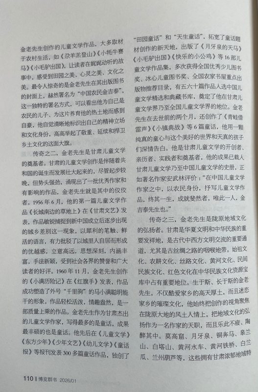 傳奇之二,金老先生是甘肅兒童文學(xué)的奠基者。甘肅的兒童文學(xué)創(chuàng)作是伴隨著共和國(guó)的誕生而發(fā)展壯大起來的,盡管起步較晚,但勢(shì)頭強(qiáng)勁,涌現(xiàn)出了一批優(yōu)秀作家和有影響的作品,金老先生就是其中的佼佼者。1956年6月,他的第一篇兒童文學(xué)作品《長(zhǎng)城南邊的草地上》在《甘肅文藝》發(fā)表,作品敏銳捕捉到新中國(guó)成立后逐步出現(xiàn)的城鄉(xiāng)差別這一現(xiàn)象,以犀利的筆觸、鮮活的語(yǔ)言,有力批駁了以城里人自居而形成的優(yōu)越感,立意高遠(yuǎn),思想深刻,內(nèi)涵豐富,手法新穎,受到社會(huì)各界的贊譽(yù)和廣大讀者的好評(píng)。1960年11月,金老先生創(chuàng)作的《小滿歷險(xiǎn)記》在《紅旗手》發(fā)表,作品成功塑造了外號(hào)“千里駒”的馬小滿聰明能干的形象,作品輕松活潑,情趣盎然,是一部質(zhì)量上乘的作品。金老先生作為甘肅杰出的兒童文學(xué)作家,寫得最多的是童話,成果最豐碩的也是童話。他先后在《兒童文學(xué)》《東方少年》《少年文藝》《幼兒文學(xué)》《童話報(bào)》等報(bào)刊發(fā)表300多篇童話作品,獨(dú)創(chuàng)了“田園童話”和“天生童話”,拓寬了童話題材創(chuàng)作的新天地,出版了《月牙泉的天馬》《小毛驢出國(guó)》《快樂的小公雞》等16部?jī)和膶W(xué)作品集,多次獲得全國(guó)優(yōu)秀少兒圖書獎(jiǎng)、冰心兒童圖書獎(jiǎng)、全國(guó)農(nóng)家書屋重點(diǎn)出版物推薦目錄,有五六十篇作品入選中國(guó)兒童文學(xué)精選和典藏書庫(kù),奠定了他在甘肅兒童文學(xué)界乃至全國(guó)兒童文學(xué)界的地位。金老先生在去世前的兩個(gè)月,還創(chuàng)作了《青蛙借雷聲》《小鎮(zhèn)典故》等6篇童話,他用一顆純真的童心與這個(gè)美好的世界和天真的孩子們深情告白。他是甘肅兒童文學(xué)的開創(chuàng)者、親歷者、實(shí)踐者和奠基者,他的成果已載入甘肅兒童文學(xué)乃至中國(guó)兒童文學(xué)的史冊(cè),正如著名作家安武林評(píng)價(jià):“在中國(guó)兒童文學(xué)作家之中,以農(nóng)民身份,抒寫兒童文學(xué)作品,終其一生,成就斐然者,唯此一人,金吉泰先生也。”