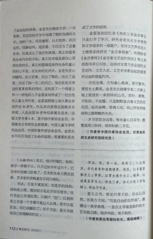 金雷泉的回憶錄《我的父親金吉泰》,只是打開了學(xué)習(xí)、研究金老先生文學(xué)理想和文學(xué)追求的一扇窗戶,有待文藝界有志人士繼續(xù)系統(tǒng)研究“金吉泰現(xiàn)象”。我期盼有《金吉泰傳》《金吉泰文藝創(chuàng)作探究》等之類的圖書早日問世,這將對(duì)甘肅乃至全國(guó)的文藝創(chuàng)作、文藝人生、文藝未來都會(huì)起到重要的啟迪和借鑒作用。