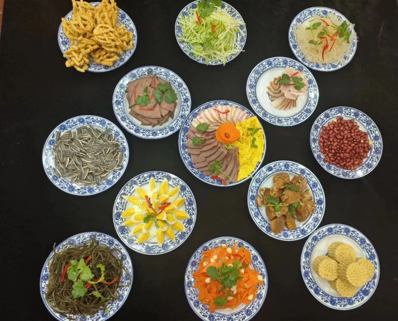 以常見的“十三花”為例,“十三花”,即十二個(gè)佐酒涼菜,加一旋菜全盤。整體具有太陽(yáng)花或旋轉(zhuǎn)八卦意象,遂美稱為“花”。