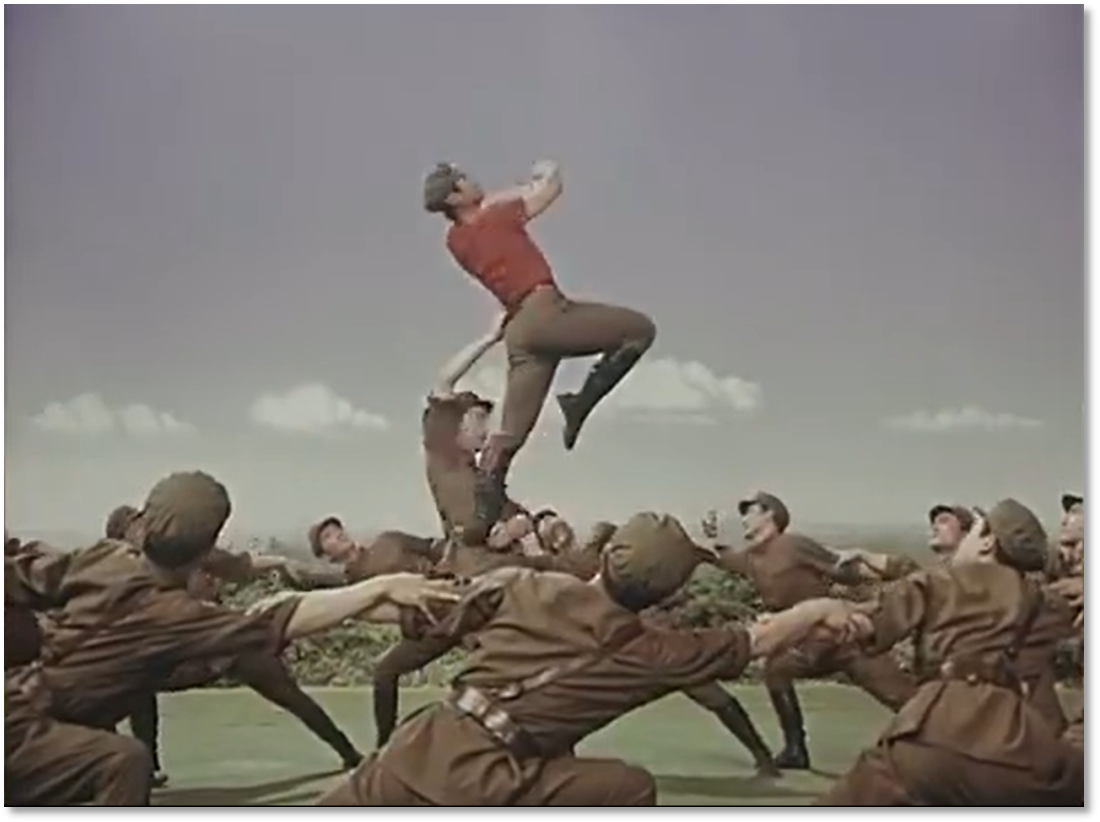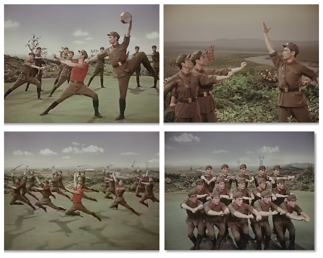 有趣的是,膠片并非被動(dòng)記錄,它悄然行使著選擇的權(quán)力——它決定了后世的人們將以何種視角、何種景別來(lái)銘記《戰(zhàn)馬嘶鳴》。在鏡頭中定格下來(lái)的膠片拷貝,就此定義了經(jīng)典的面貌。從舞臺(tái)到膠片,作品完成了一次關(guān)鍵的媒介化轉(zhuǎn)身,從一場(chǎng)限時(shí)演出,變身為一個(gè)時(shí)代的文化符號(hào)。這使軍藝精神在沒(méi)有數(shù)字媒體的時(shí)代,得以廣泛流傳和保存。