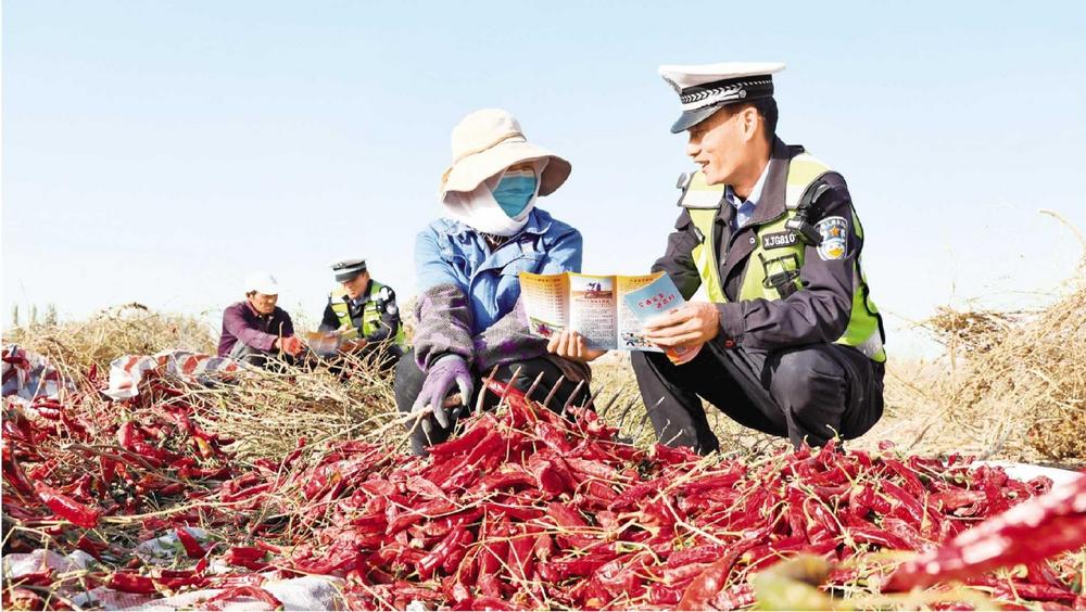 民警在田間地頭向群眾講解交通安全知識(shí)。近日,高臺(tái)縣公安局交通管理大隊(duì)駱駝城交警中隊(duì)民輔警通過發(fā)放宣傳資料、以案釋法、與村民面對面交流等方式,宣傳道路交通安全法律法規(guī),維護(hù)好豐收季節(jié)農(nóng)村道路交通秩序。新甘肅·甘肅法治報(bào)通訊員 蔣雯麗 攝