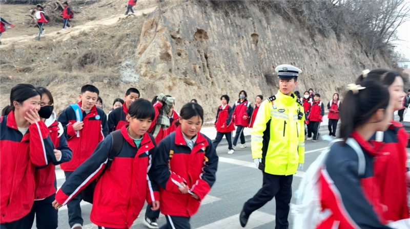 ▲東鄉(xiāng)縣公安局民輔警開展護(hù)學(xué)工作,重點(diǎn)在校園周邊開展交通疏導(dǎo)、清理違停車輛、引導(dǎo)學(xué)生安全過馬路。(完瑪草 攝)