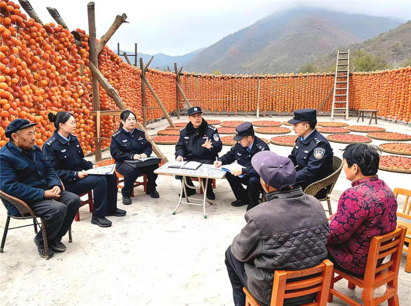 ▲舟曲縣公安局城關(guān)派出所民輔警深入轄區(qū)柿子晾曬場和柿子收購點(diǎn),開展反詐宣傳活動(dòng)。(朱彤 攝)