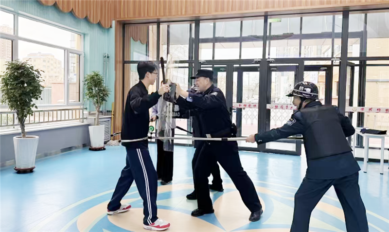 上午10時,校園內(nèi)突然響起急促的警報聲,“最小應急單元”實戰(zhàn)化演練正式啟動。一名“可疑人員”手持仿真刀具試圖闖進校園,校門口安保人員立即舉起防暴盾牌上前攔阻,大聲喊話警示:“站??!不許進來!”與此同時,值班老師迅速組織學生:“快!躲到桌子底下!”隨后帶領(lǐng)學生彎腰低頭、雙手抱頭,沿著安全通道有序疏散。另一邊,家長志愿者與趕來的民警合力配合,用鋼叉成功控制住“可疑人員”。整個應急處置過程緊張有序,僅用3分鐘便順利完成。