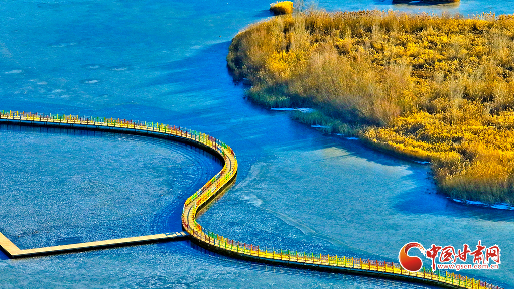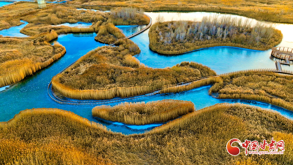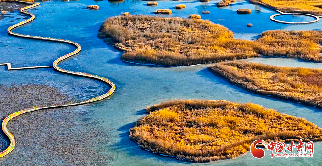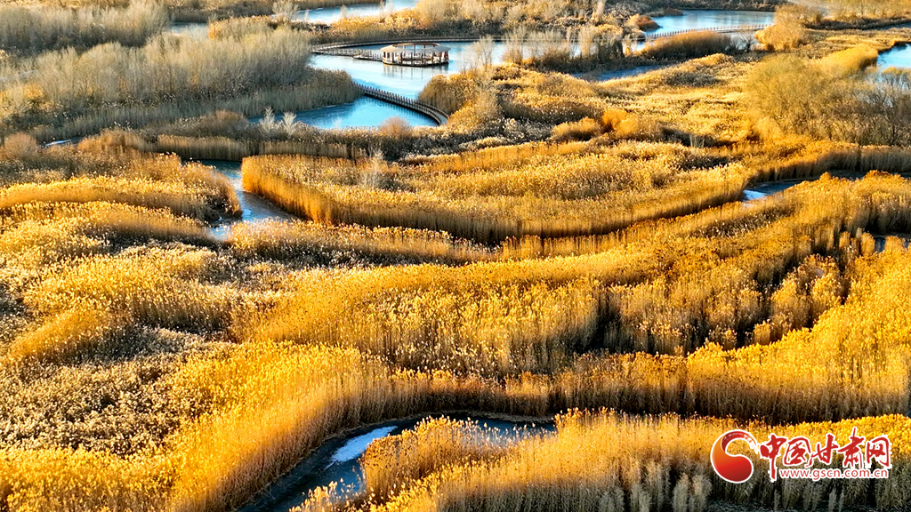 12月4日,張掖市黑河濕地國家級自然保護區(qū)內(nèi),經(jīng)風霜浸染的蘆葦與蒲草披上金裝。從高空俯瞰,夕陽下的蘆葦蕩如金色海洋,蘆花隨風輕舞,碧水凝冰環(huán)繞其間,宛如一幅鋪展的濕地金畫卷,吸引眾多游客與攝影愛好者前來觀賞拍攝。