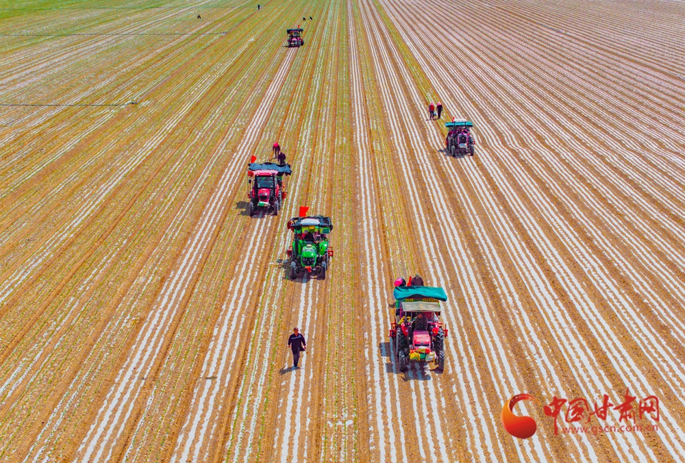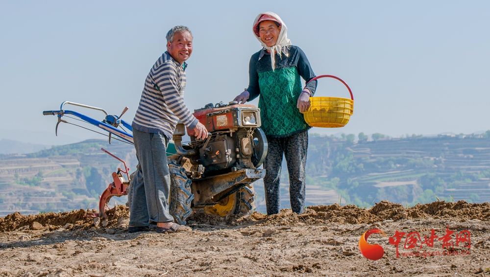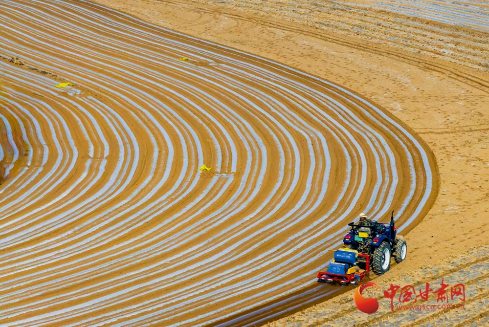 春日,走進定西臨洮的田間地頭,一壟壟覆膜蜿蜒如銀色絲帶,在暖陽下泛起粼粼波光。洮河水畔,杏花初綻,村民們正彎腰點種、培土壓膜。新翻的泥土氣息混著花香彌漫田間。農(nóng)機轟鳴處,白膜與藍天相映,勾勒出黃土高原上最動人的春耕畫卷。