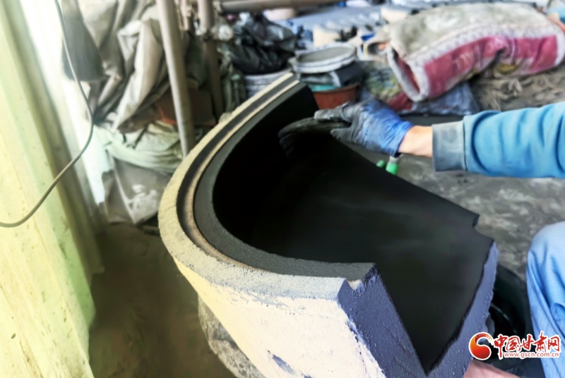 如果說兌沙是技藝的根基,那“制模”便是它的靈魂。團(tuán)沙成坯、旋出弧度、拍實(shí)定型、分塊剪下,再用刻刀一點(diǎn)點(diǎn)勾勒出內(nèi)壁的紋路,接著在模具上精雕出藏八寶、龍紋等花紋,最后將外殼合在內(nèi)模上、抹平縫隙、層層加固——一套模具經(jīng)歷這些工序才能慢慢成型,但是澆筑后便會(huì)碎毀。