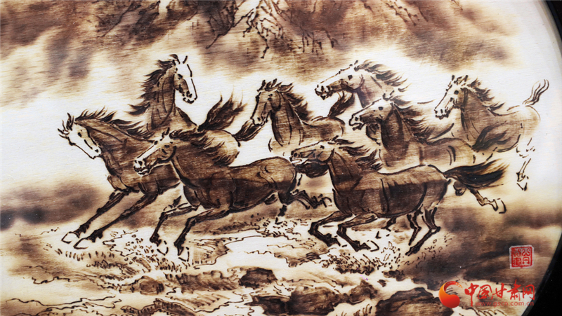 從學(xué)徒到代表性傳承人,張志光的堅(jiān)守藏在日復(fù)一日的練習(xí)里。他不僅精通山丹烙畫的選材、畫面設(shè)計(jì)及裝飾工藝,更在2018年邁出創(chuàng)新步伐——將山丹馬元素融入創(chuàng)作。手持電烙鐵在木板上游走,他筆下的山丹馬或奔騰跳躍、或昂首嘶鳴,線條流暢、明暗有致,仿佛被賦予生命,盡顯西北大地的豪邁神韻。“山丹烙畫是我一生的熱愛,早成了生活里離不開的部分。”張志光的話語里,滿是對這門技藝的深情。