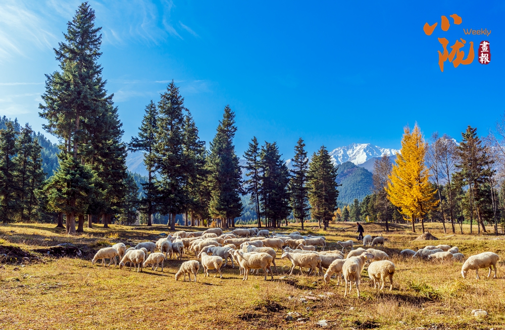 大地披上了金色的盛裝,悠然自得的羊群、五彩的樹(shù)木,與遠(yuǎn)處的雪山和湛藍(lán)的天空、潔白的云朵,共同繪制成一幅初冬最亮麗的風(fēng)景畫(huà)。