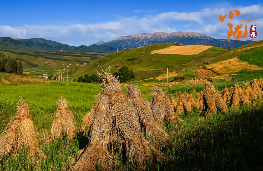 目之所及,金黃的麥捆與綠色相互映襯,用最燦爛最飽滿(mǎn)的顏色詮釋這片土地的豐收與希望。而遠(yuǎn)處連綿起伏的山巒,更是為這幅畫(huà)卷增添了幾分雄渾而壯闊。
