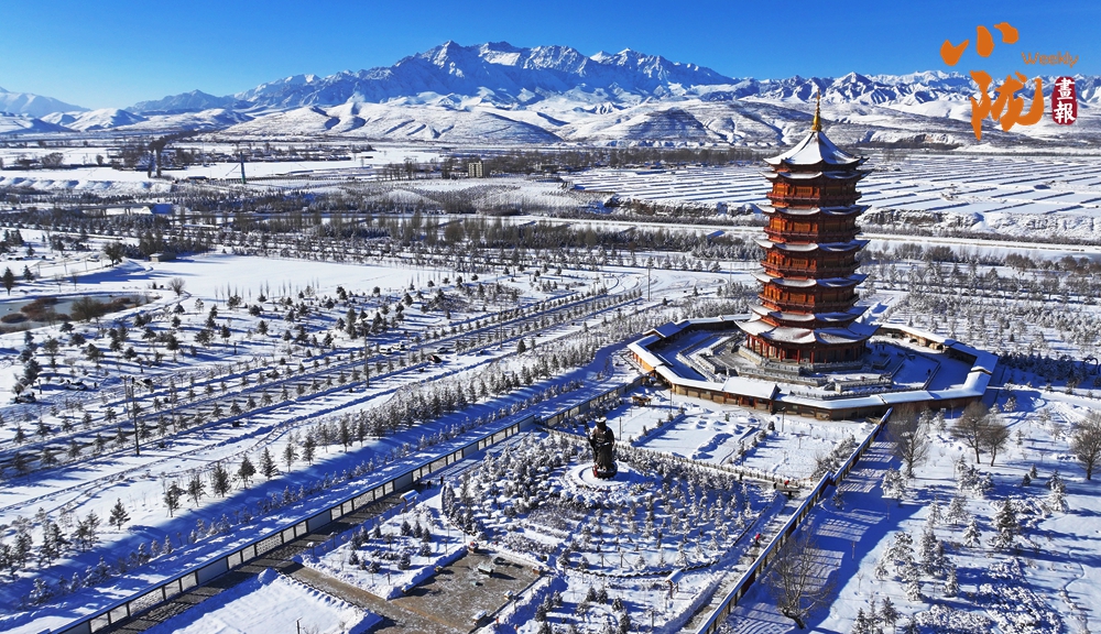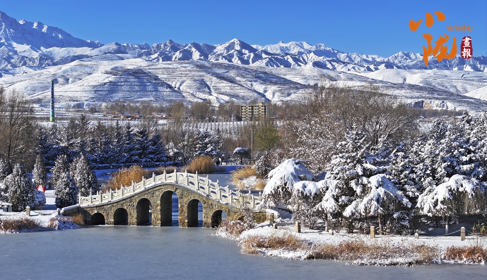 雪后初霽,銀白的民樂公園,在陽光下熠熠生輝,安靜且神秘,與遠處綿延的祁連山構(gòu)成一幅璀璨的畫卷。