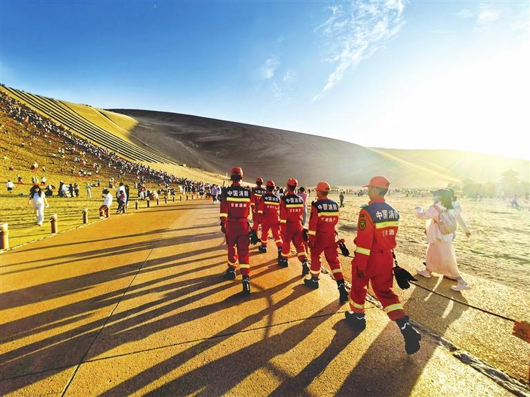 溫情關(guān)愛救助游客。鳴沙山“萬(wàn)人大合唱”作為敦煌近年來的熱門文旅項(xiàng)目,暑期每日吸引數(shù)萬(wàn)游客前來打卡,人群密集,安全隱患不容忽視。根據(jù)敦煌市委、市政府的安排,大隊(duì)每天派出消防車輛和指戰(zhàn)員現(xiàn)場(chǎng)執(zhí)勤,并根據(jù)實(shí)際需要在月牙泉和鳴沙山設(shè)置了兩處群眾服務(wù)救助執(zhí)勤點(diǎn),由20人組成“九色鹿”女子消防服務(wù)隊(duì),提供傷病緊急救助、失物尋找、人員疏散引導(dǎo)、安全知識(shí)宣傳教育等服務(wù)。僅今年,就幫助找回走失兒童21名、手機(jī)和錢包60余件,救助中暑等突發(fā)疾病游客7人。“九色鹿”女子消防服務(wù)隊(duì)的隊(duì)員們既懂外語(yǔ),又了解敦煌文化,還熟悉消防安全知識(shí),掌握一定的醫(yī)療救助和應(yīng)急救援技能,她們的貼心服務(wù)受到了游客的好評(píng),成為敦煌一道亮麗的風(fēng)景線。