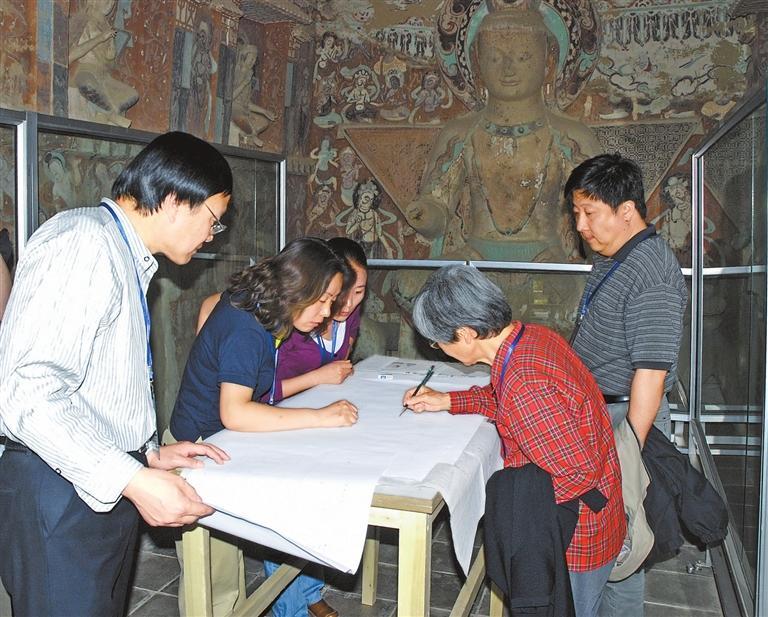 樊錦詩帶領(lǐng)項目團(tuán)隊在莫高窟第275窟核對石窟考古報告測繪圖。