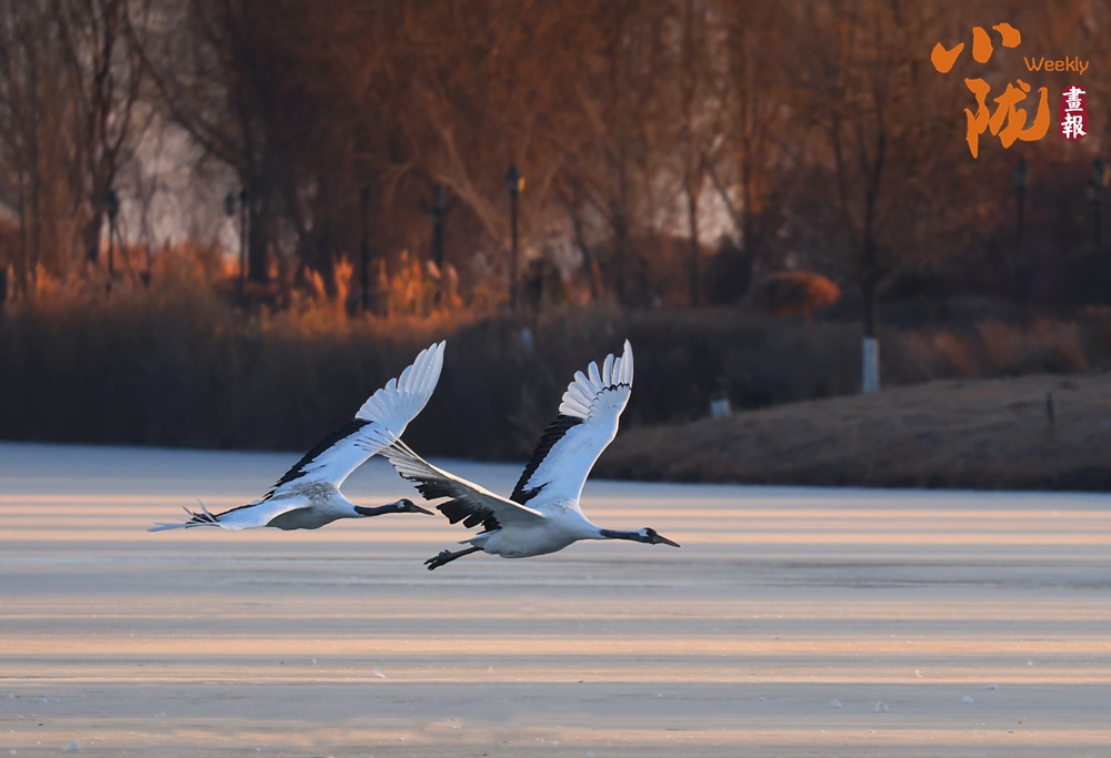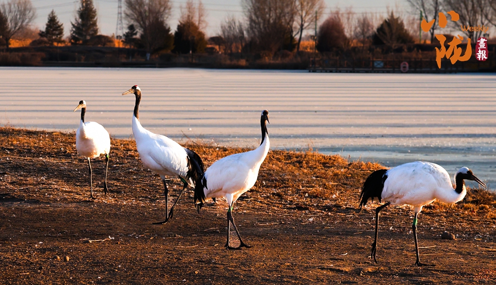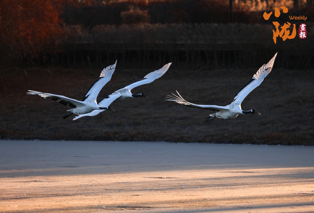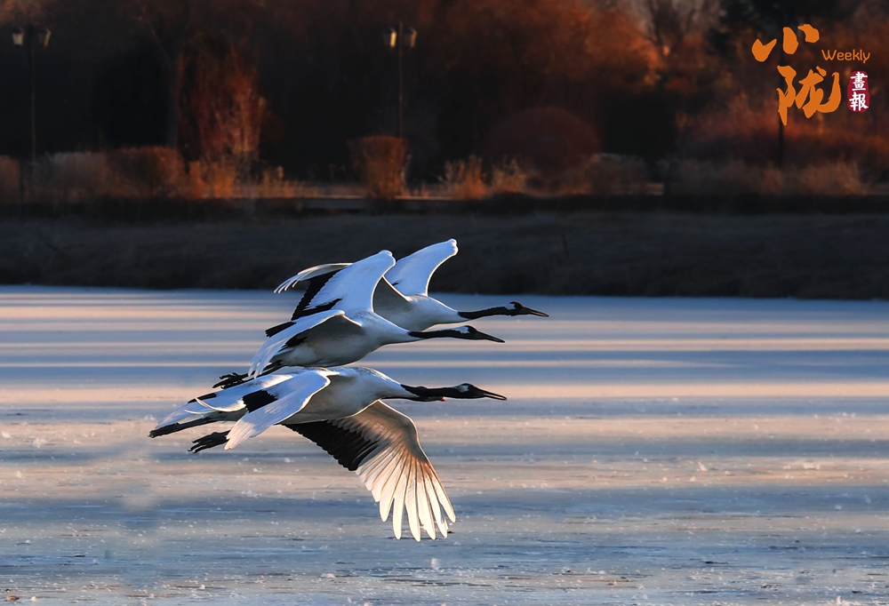 冰面映照著澄澈藍天,丹頂鶴展翅掠水,引頸高歌,清脆的鳴叫聲仿佛是大自然奏響的美妙樂章。