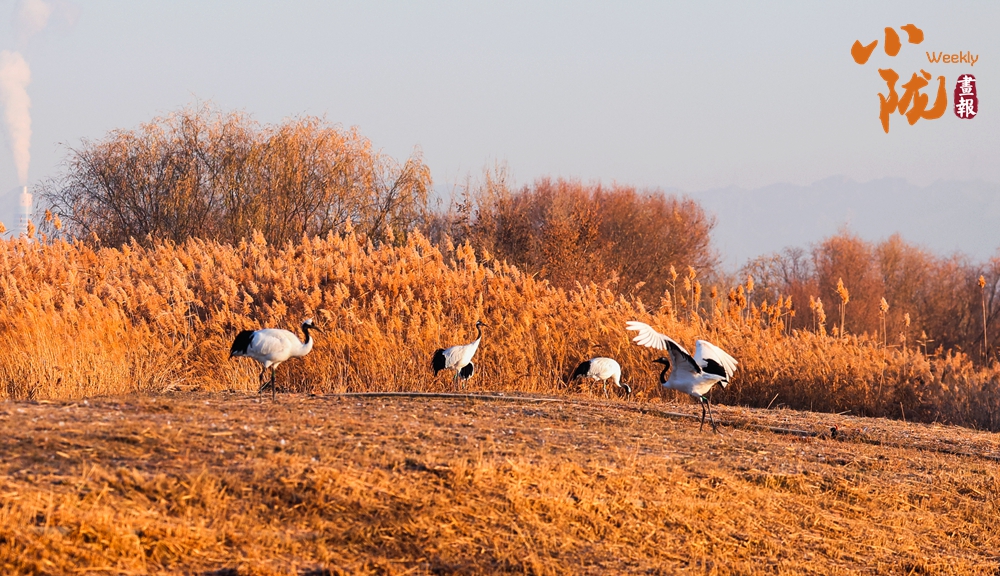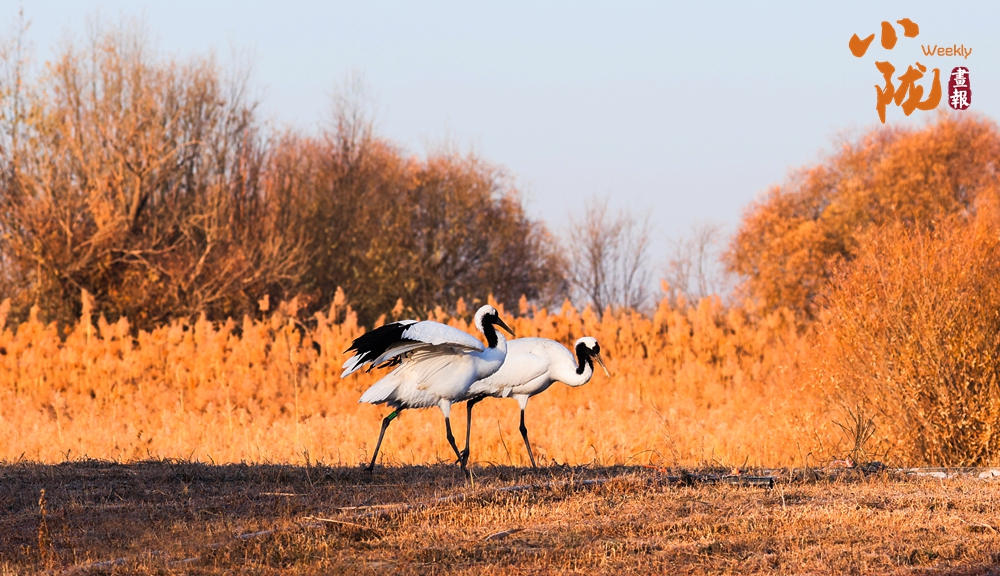 丹頂鶴時而凌空飛舞,時而散步、覓食,穿梭在金黃的蘆葦間。