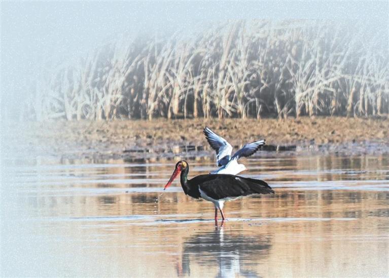 黑河濕地的“明星候鳥”,當數(shù)灰鶴。每年初冬,都會有上千只灰鶴從西伯利亞飛來,在這里越冬。灰鶴的體形高大,羽毛呈灰褐色,長長的雙腿在淺水中行走時格外穩(wěn)健,頭頂前部的紅色裸區(qū)是它們最顯著的標志。