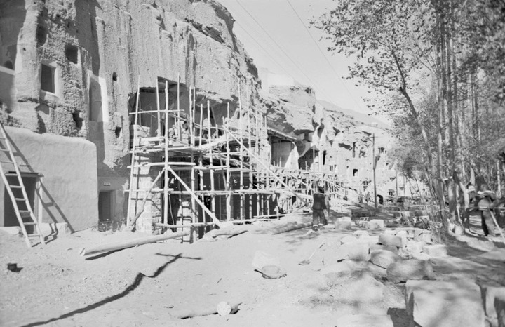 工作人員對莫高窟部分洞窟進行加固施工(1964年7月8日攝)。敦煌研究院供圖