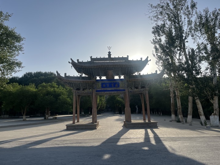 大牌坊是莫高窟另一處標志性景觀。要進入莫高窟窟區(qū),首先得經(jīng)過這座莊重質(zhì)樸、飛檐翹角的牌坊。牌坊匾額東面是“石室寶藏”,西面是“三危攬勝”,夕陽西下時,更顯古韻。