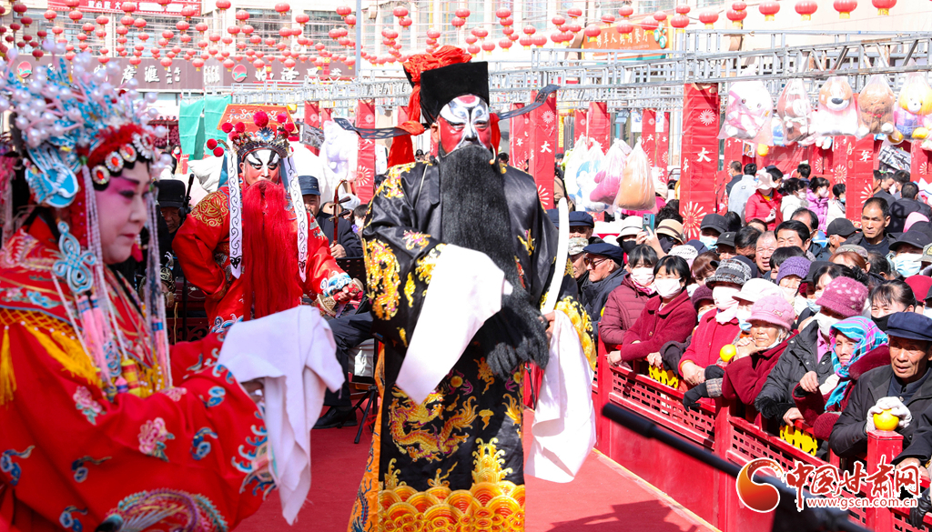 3月3日,張掖市臨澤縣金澤廣場上,群眾表演“驚牛”戲。