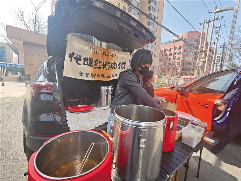 上午11時(shí)20分,甘南路民族飯店門口的人行道上,一輛簡(jiǎn)易流動(dòng)餐車準(zhǔn)時(shí)支起攤位。不銹鋼餐盆里,色澤鮮亮的炒肉片蓋飯熱氣升騰,濃郁香氣順著風(fēng)飄向周邊寫字樓,短短幾分鐘,攤位前就排起了七八人的小長隊(duì)。“老板,一份炒肉片蓋飯,多放青椒和咸菜!”“我要兩份,打包帶走!”熟練打飯、快速裝盒、掃碼收款,一氣呵成,不到20分鐘,桶里的米飯就下去了小半桶。
