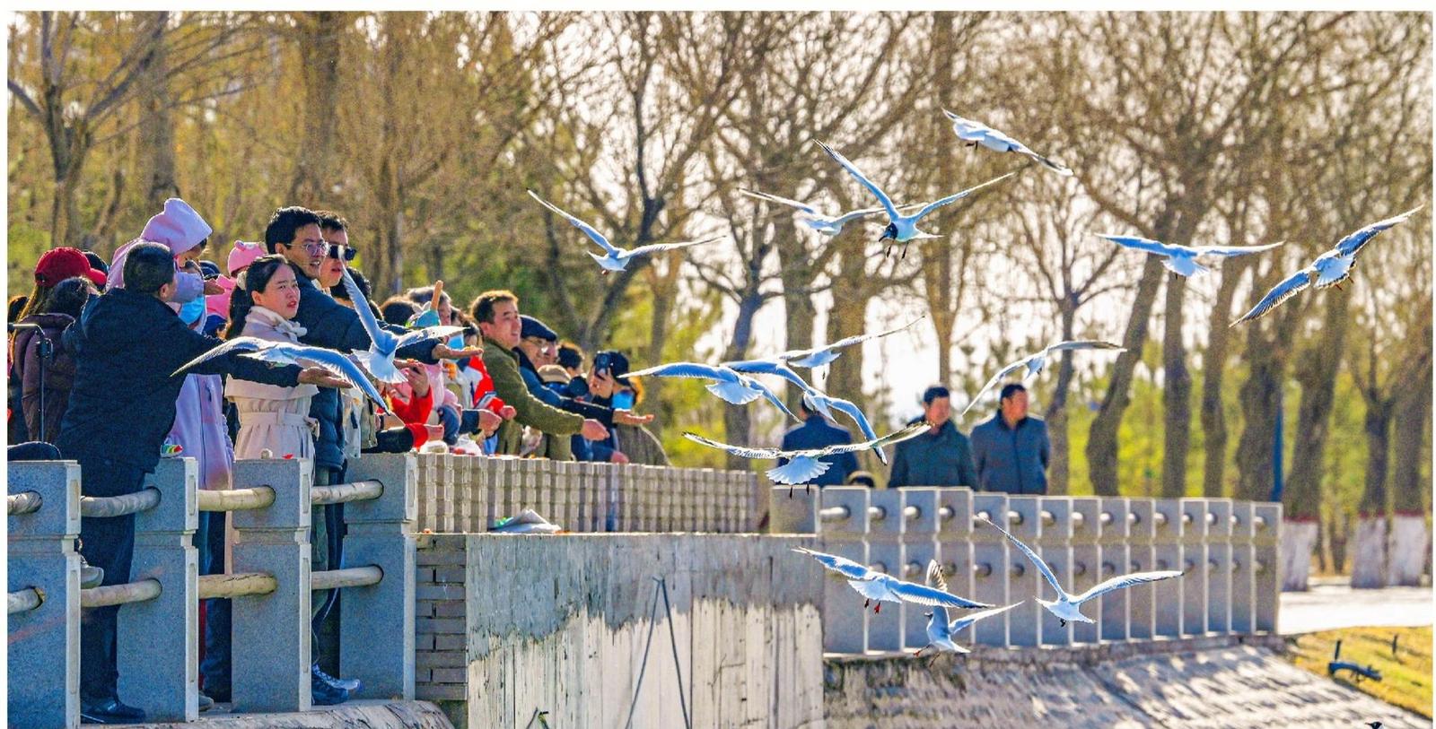 戈壁雄關(guān)迎鷗鳥(niǎo),羽翼翩翩贊綠洲。連日來(lái),大批鷗鳥(niǎo)分批飛抵我市討賴(lài)河生態(tài)文化景區(qū),或舒展輕盈舞姿與岸邊市民互動(dòng),或在氣盾壩上“列隊(duì)”小憩,或結(jié)伴翱翔感受春日暖陽(yáng),盡情享受著我市持續(xù)向好的生態(tài)環(huán)境。(照片由融媒體中心記者 李巍 攝)
