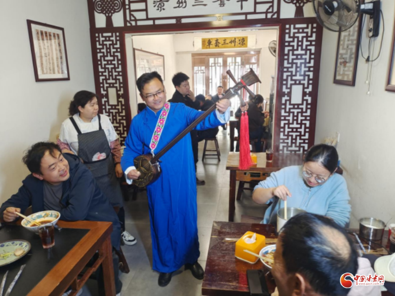 當日,北關市場內人流如注、熙熙攘攘,眾多游客與市民齊聚于此,享受美味的同時觀看涼州賢孝和永昌滾燈,涼州賢孝傳承人賈旭峰與用餐的游客進行了互動,人們安逸地享受著這份獨具涼州特色的煙火美味。