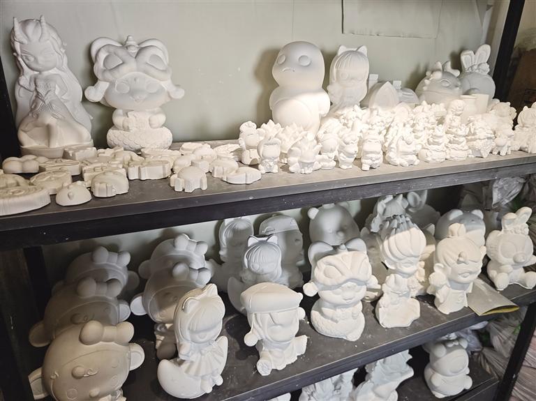 價格方面,店內(nèi)走親民路線。石膏彩繪體驗分為三個檔位,對應(yīng)不同大小的白坯模型。面對在款式間猶豫的顧客,工作人員耐心介紹:“小的是9.9元,稍微大一點的19.9元,再大一些的29.9元。趕時間的話,選小一點的,完成得快,也不耽誤后續(xù)安排。”