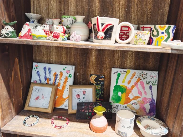 貨架上,各類手工成品整齊擺放:色彩豐富的拼豆掛件、簡約精致的銀戒指、溫潤質(zhì)樸的陶土杯、造型可愛的石膏玩偶,每一件都帶著手工獨有的溫度。