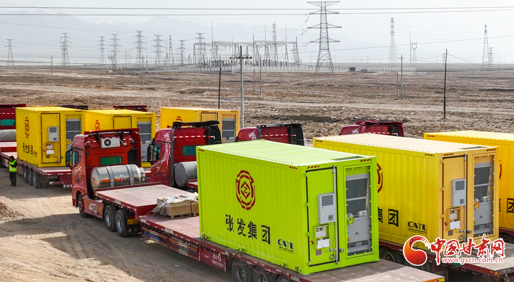 3月19日,張掖市山丹縣東樂(lè)灘上,大型運(yùn)輸車輛正在拉運(yùn)一臺(tái)臺(tái)“超級(jí)充電寶”。
