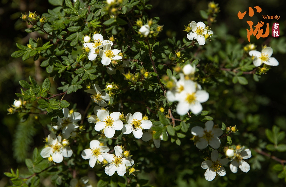 銀露梅,屬于薔薇科委陵菜屬落葉灌木。它多生長在高海拔的山坡、巖石縫中,葉片羽狀分裂,邊緣帶鋸齒,白色小花簇擁開放,花蕊明黃,花期在5-7月,耐寒耐旱,是頗具觀賞價值的野生植物。