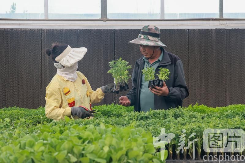 2026年4月25日,甘肅省酒泉市金塔縣禾豐種苗專業(yè)合作社基地的溫室大棚內(nèi),辣椒、西紅柿等菜苗長(zhǎng)勢(shì)喜人,工人們忙著為村民挑選優(yōu)質(zhì)菜苗。